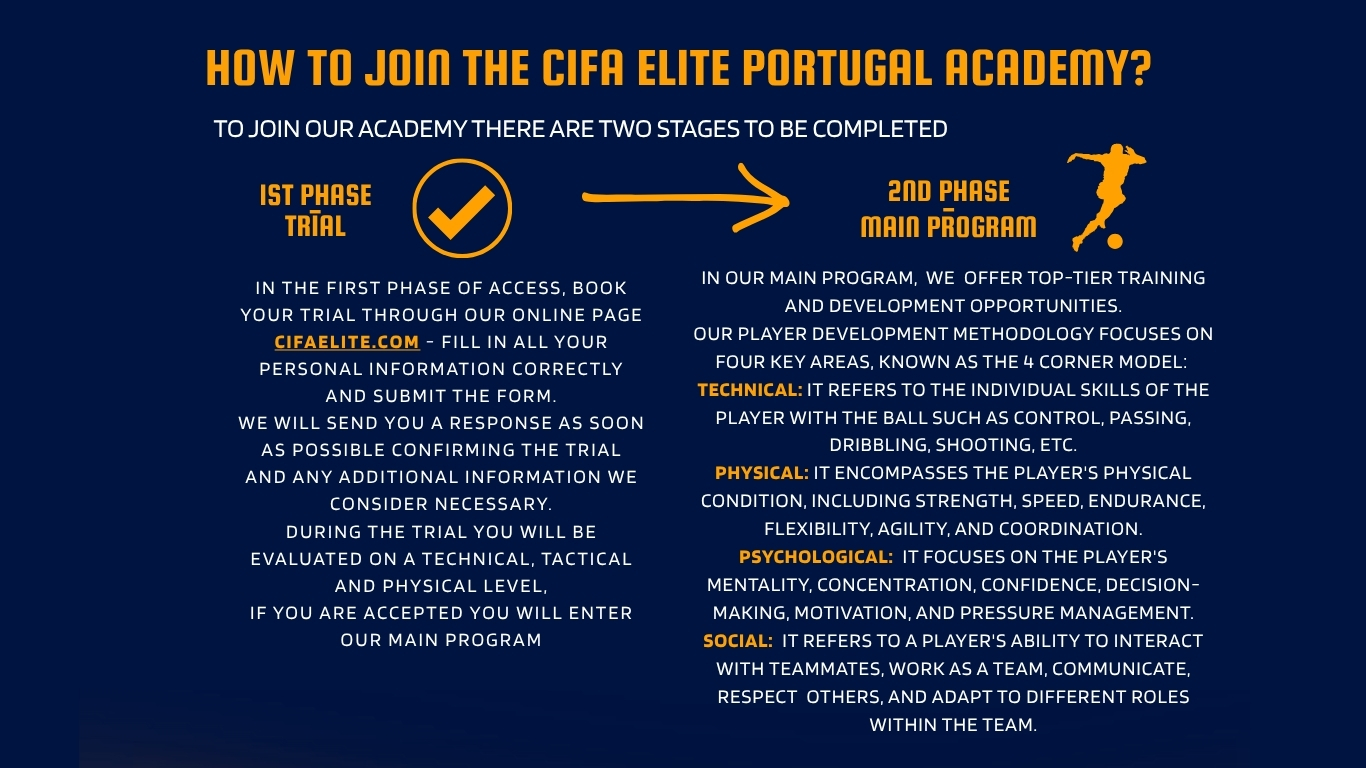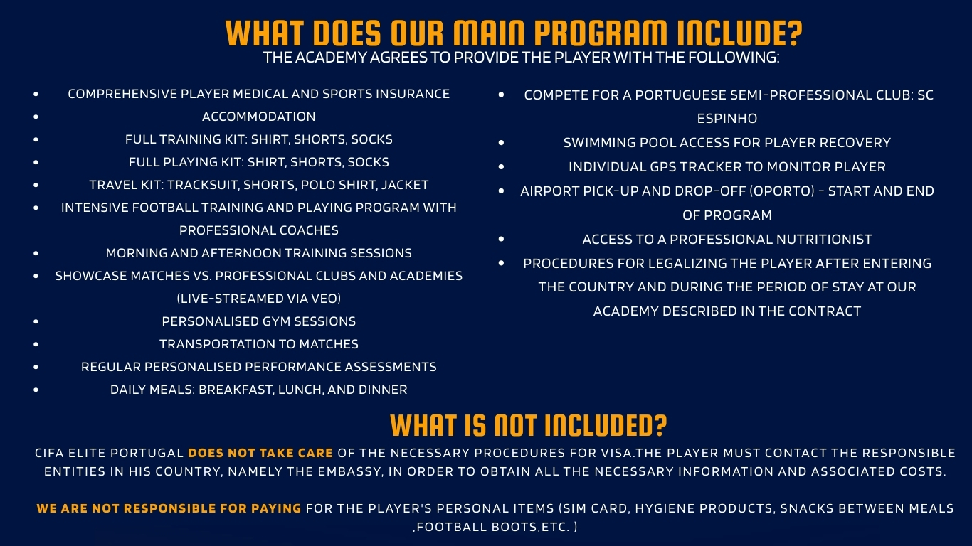 CIFA Elite Portugal is a premier football program designed for U16 to U23 teams, offering top-tier training and development opportunities. Players will reside together in high-quality accommodations, fostering team spirit and camaraderie. Our expert coaching staff will provide intensive training five days a week, focusing on technical skills, tactical awareness, and physical conditioning. Competitive matches on weekends will enhance gameplay experience, ensuring players develop both individually and as a cohesive unit. This immersive program is ideal for athletes looking to elevate their performance in a professional football environment.